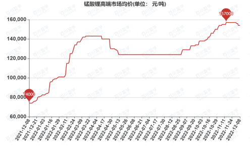 截止2022年12月8日,锰酸锂动力型市场均价在15.4万元/吨,较上月下跌0.3万元/吨;锰酸锂容量型市场均价在14.8万元/吨,较上月下跌0.4万元/吨。近期原料碳酸锂市场较为动荡,11月国内碳酸锂期货价格突然出现下跌,之后市场价格一路下行,锰酸锂的成本支撑不断减弱。再叠加进入12月,终端电动两轮车市场进入传统淡季,数码市场销量相比前期减少也较明显,锰酸锂的需求转弱。在成本层面与需求层面的双重影响下,锰酸锂生产企业报价出现松动,价格缓慢下行。大型企业订单多已签订至12月,而部分小型企业所受影响较大,开工较为谨慎,出货量有所减少。
