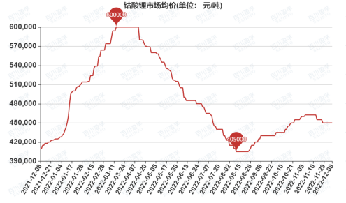 截止2022年12月8日,钴酸锂4.35v市场均价在45万元/吨,价格弱稳运行。近期钴酸锂价格走弱,主因仍是原料价格影响,碳酸锂市场贸易散单价格不断下滑,市场电碳价格在56万元/吨左右,四氧化三钴价格在21.5-22.0万元/吨,两大原料双双走弱,钴酸锂成本支撑不足,价格难以企稳。而年关将至,终端数码市场尚未出现明显恢复信号,业内多看空后市市场,厂家让利出货心态增加,而下游厂家备货意愿不高,入市询盘较少,钴酸锂出货承压,议价权倾向买方市场。