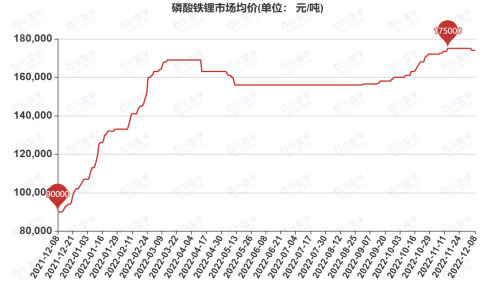 截止2022年12月8日,磷酸铁锂动力型市场均价在17.4万元/吨。近期磷酸铁锂价格小幅下滑,原料碳酸锂受需求影响,市场贸易散单价格几度下跌,传导至磷酸铁锂成本支撑走弱,实际成交重心下移。需求端,在前期抢装热度褪去,磷酸铁锂高需求阶段已经结束,虽终端年底冲销行为较为积极,但下游厂家多持观望心态,出售自身库存为主,对于磷酸铁锂维持刚需采购,预计12月磷酸铁锂产量将会有所下滑。但由于储能市场的一定支撑,下滑幅度不会过大,市场整体需求优于三元材料。