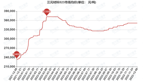 截至2022年12月8日,523市场均价在35.15万元/吨;三元材料622市场均价在37.55万元/吨;811市场均价在40.05万元/吨。近期三元材料市场价格保持弱稳。终端需求方面,进入12月,终端动力市场需求不佳,下游电池厂采购情绪较弱,外加新年将至,下游控制库存,采购意愿不佳。另外,“国补”政策即将结束,后市市场不确定性较强,带动三元材料需求减弱,12月各大企业计划减产。原料端,钴盐因订单不足,价格持续下滑;镍盐因需求下降,成交清淡,市场价格弱势运行。锂盐供应依旧短缺,但受到终端需求影响,价格持续下调。
