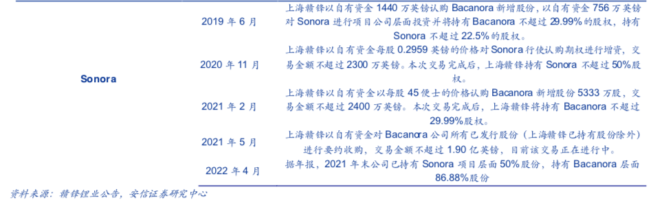 据年报显示,截至2021年年底赣锋锂业已经持有Sonora项目层面50%的股权。同时,公司表示,得益于锂粘土资源的独特优势,该项目的提锂工艺特点是能够同时兼具矿石提锂以及盐湖提锂的优点,既能够以类似矿石提锂的速度在短时间内完成提锂过程,也能够以类似卤水提锂的成本以较低成本完成提锂,目前该项目仍在建设过程中。