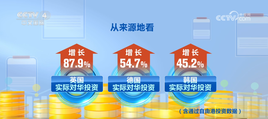 从来源地看,英国、德国、韩国实际对华投资分别增长87.9%、54.7%、45.2%。
