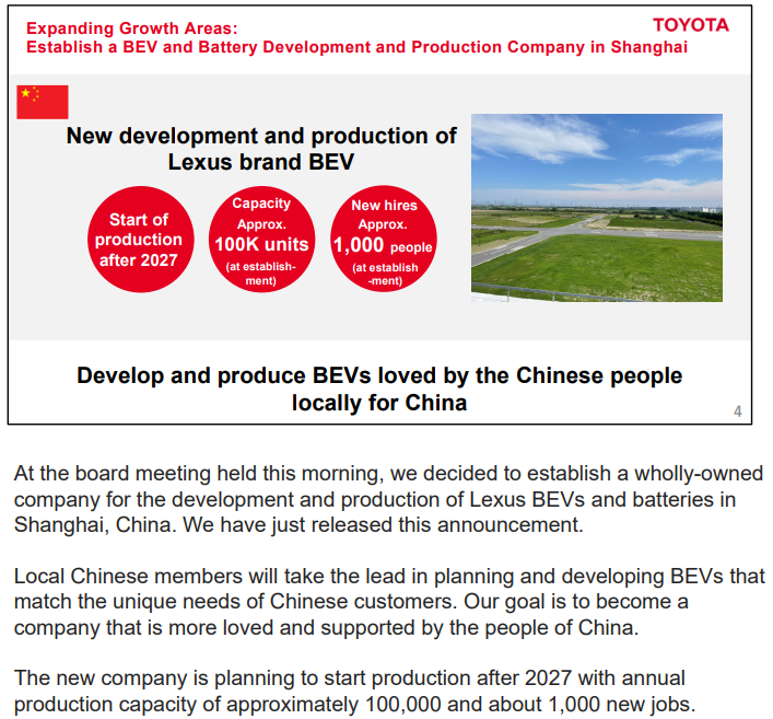 2月5日,丰田汽车公司宣布将在上海市金山区独资设立雷克萨斯纯电动汽车及电池的研发和生产公司,将依托上海市及长三角地区先进成熟的产业链基础、物流网络、人才体系及市场规模,研发LEXUS雷克萨斯品牌纯电动车型,将中国客户的期待以中国速度反映到产品中,并计划于2027年投产。