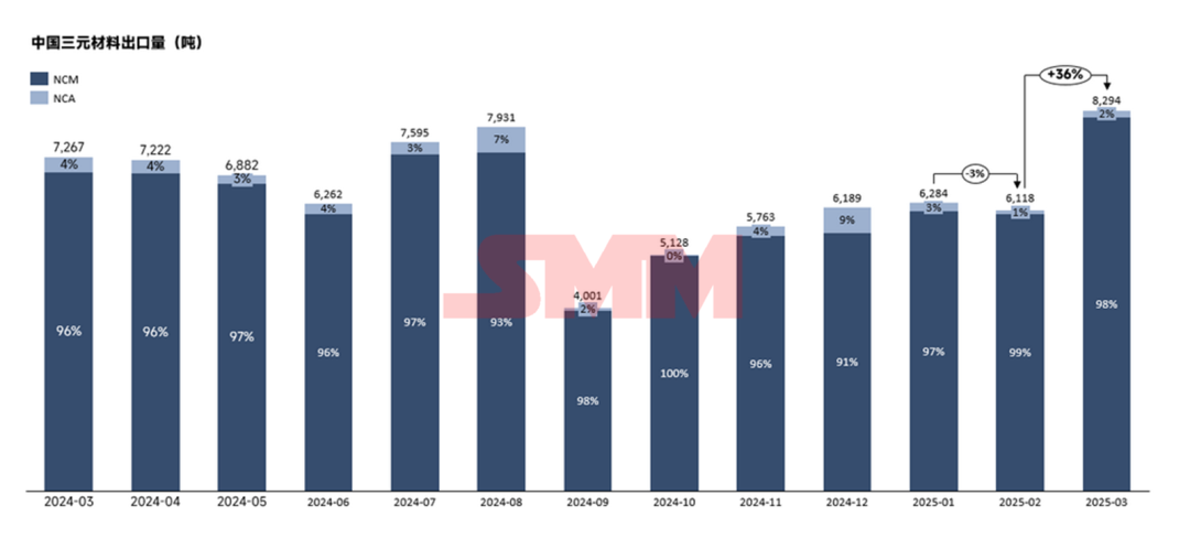 2025年3月,中国三元材料(NCM+NCA合计数值)出口量为8294吨,环比增加36%,同比增加14.14%。