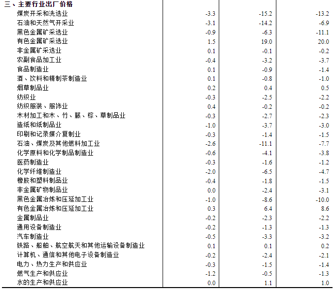 工业生产者购进价格中,燃料动力类价格下降2.3%,化工原料类价格下降0.7%,黑色金属材料类价格下降0.6%,建筑材料及非金属类价格下降0.4%,农副产品类、纺织原料类价格均下降0.2%;有色金属材料及电线类价格上涨0.7%。