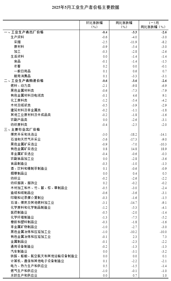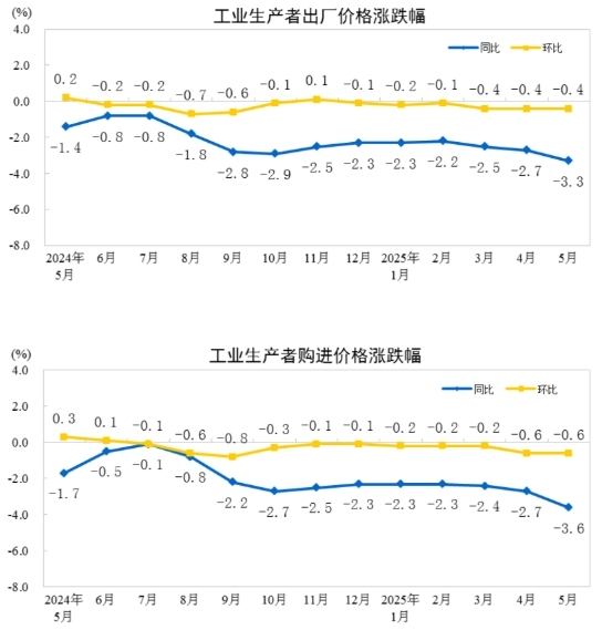 2025年5月份工业生产者出厂价格同比下降3.3%
