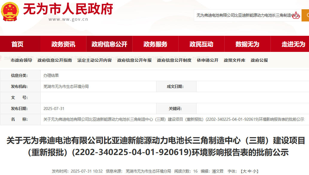 近日,安徽省芜湖市无为市生态环境分局发布关于无为弗迪电池有限公司比亚迪新能源动力电池长三角制造中心(三期)建设项目(重新报批)环境影响报告表的批前公示。
