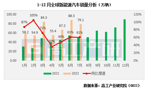 高工产业研究院(GGII)通过发布的《全球动力电池装机量月度数据库》统计显示,2022年7月全球新能源汽车销量为79.1万辆,同比增长61%,环比下降10%,1-7月合计销售487.8万辆,同比增长64%。