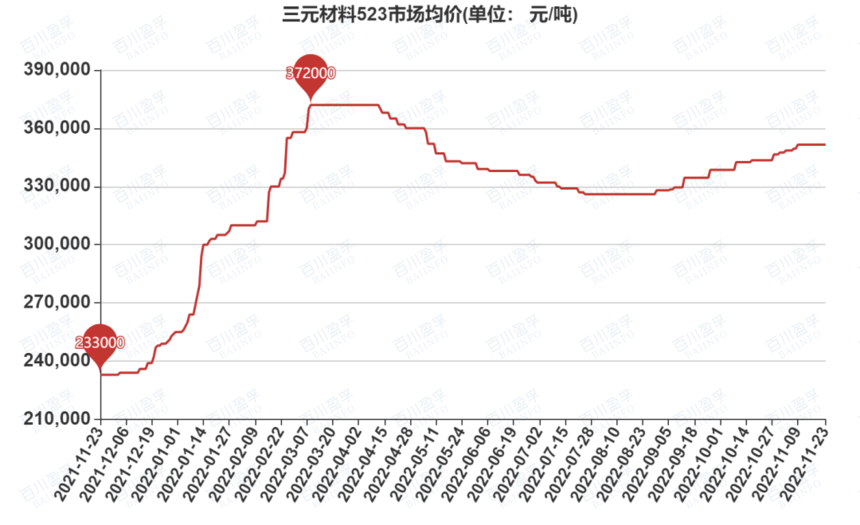 需求端10月动力电池装机量环比下滑,但是动力电池的产量小幅增加,动力市场、储能市场需求依旧旺盛,正极材料企业采买备货意愿较为积极,部分贸易商出货意愿增强,场内交投氛围好转,碳酸锂市场延续供需紧张局面,支撑行情维持高位。11月中旬对于终端车企销量走弱,产业链对此有所反应,部分电芯企业有减产计划,从而带动三元正极计划产量下调。受疫情影响,部分线下门店关闭,另外,新能源汽车政策补贴即将截至,消费者也许存在观望心态,购买意愿下降。