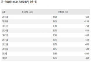碳酸锂正以超出市场预期的速度疯狂回落。 据上海有色网新报价显示,3月21日,碳酸锂(99.5%电池级/国产)下跌6500元报29.5万元/吨,已经跌破30万元大关,创逾1...2023-03-21 19:39:27