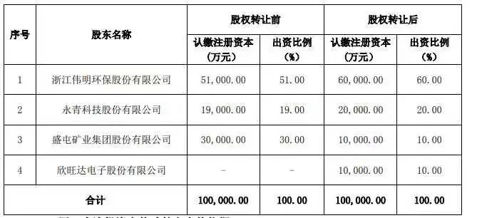 股权转让完成后,合资公司股权结构变为:伟明环保持股60%,永青科技持股20%,盛屯矿业持股10%,欣旺达持股10%。