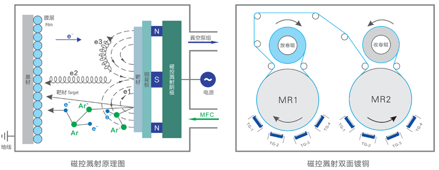 此环节的关键在于应用磁控溅射工艺使高分子材料“金属化”。具体来说,多以纯度为99.999%的铜作为靶材,在PET基膜上进行真空纳米级涂层,通过一次或多次轰击铜靶材,使其沉积在PET基膜表面,溅射形成厚度约为20nm-70nm的金属铜膜。