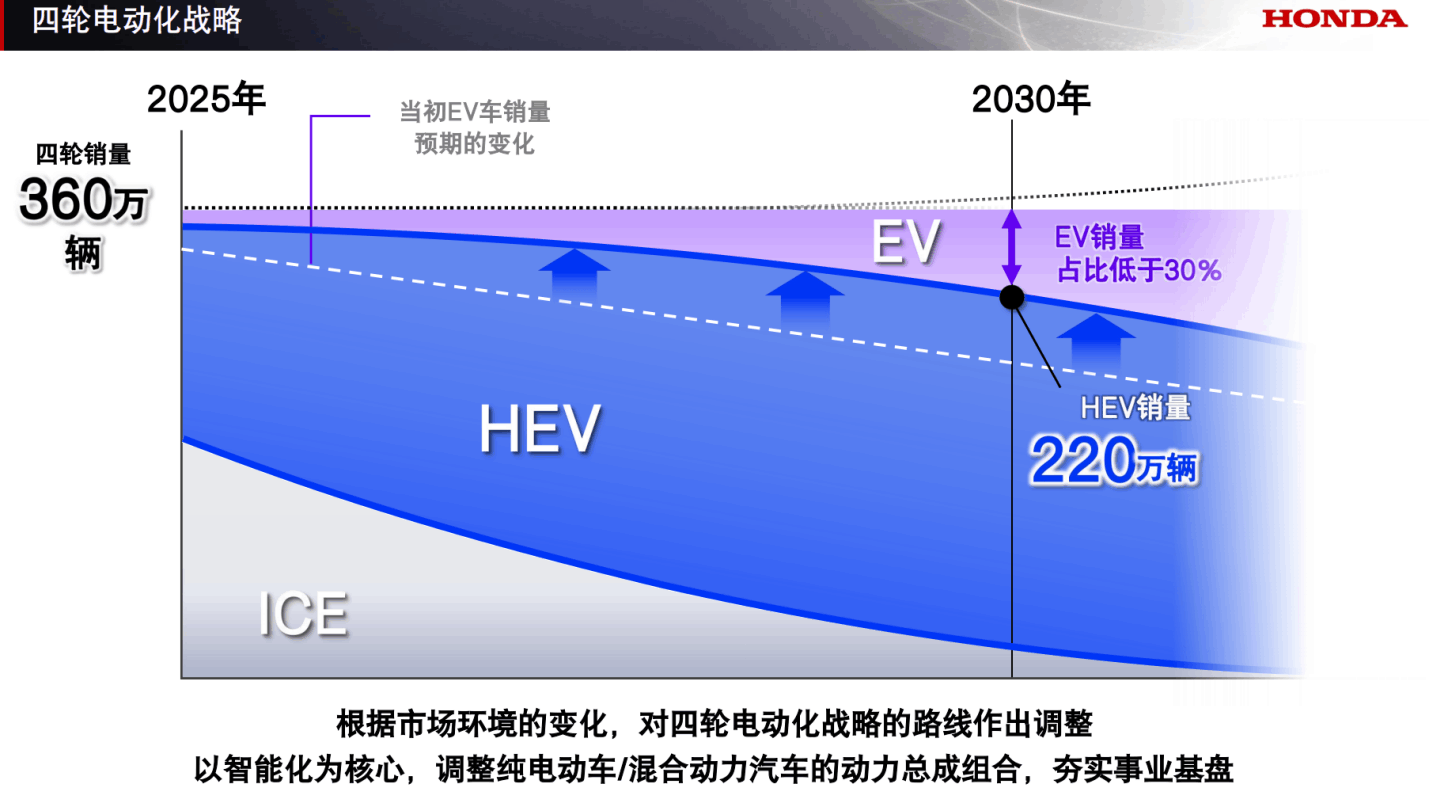 本田表示,通过切实推进此次战略调整,力争到2030年使汽车总销量较目前增加360万辆以上,其中混动车辆销量目标增加220万辆。