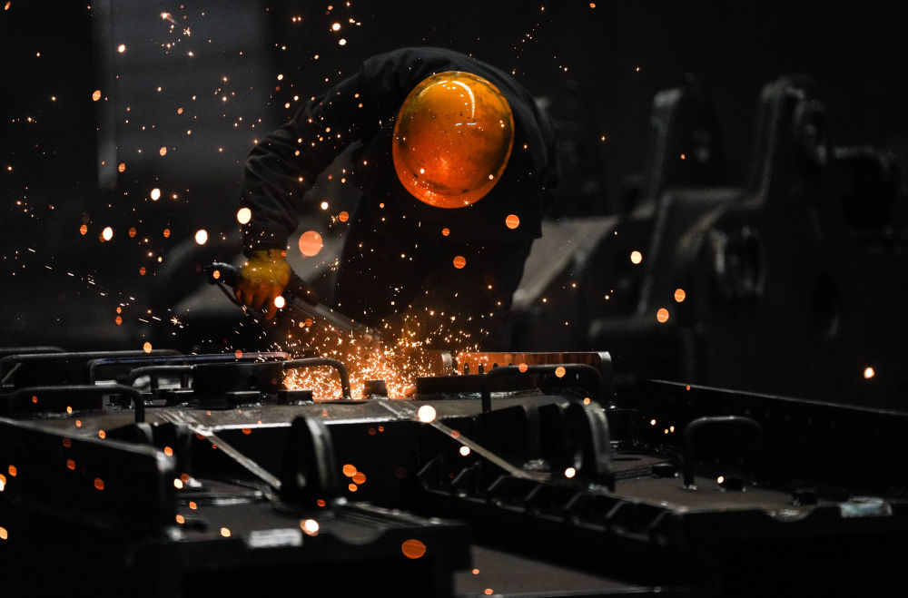 3月19日,工人在林州重机集团股份有限公司的铆焊车间进行打磨作业。