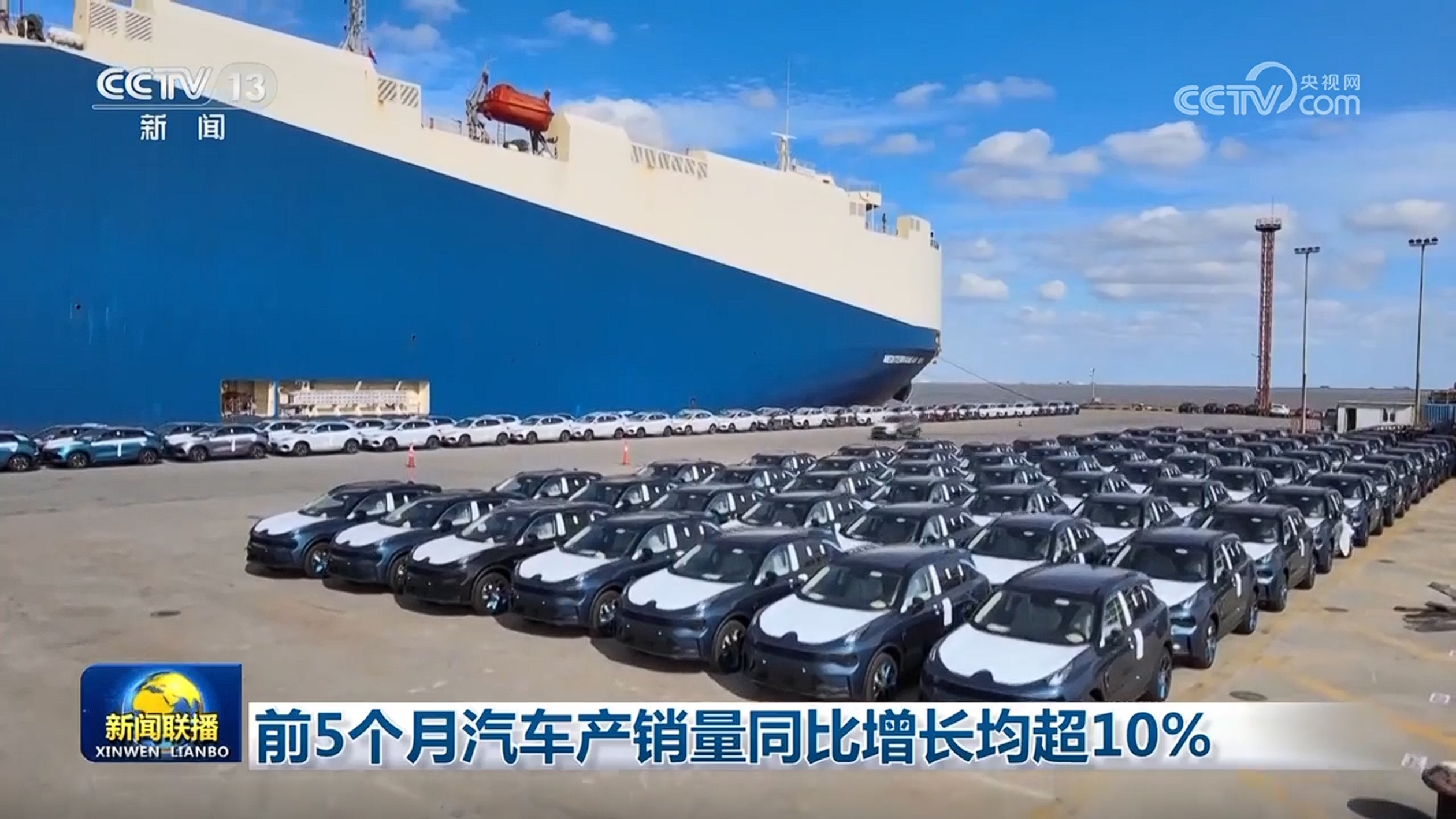 央视网消息(新闻联播):中国汽车工业协会6月11日发布的数据显示,今年以来,随着“两新”政策加力扩围,助力汽车市场消费活力加速释放。今年前5个月,我国汽车产销量分别完成1282.6万辆和1274.8万辆,同比分别增长12.7%和10.9%。其中,新能源汽车新车销量达到汽车新车总销量的44%。在出口方面,1至5月份,汽车出口249万辆,同比增长7.9%。其中,新能源汽车出口85.5万辆,同比增长64.6%。