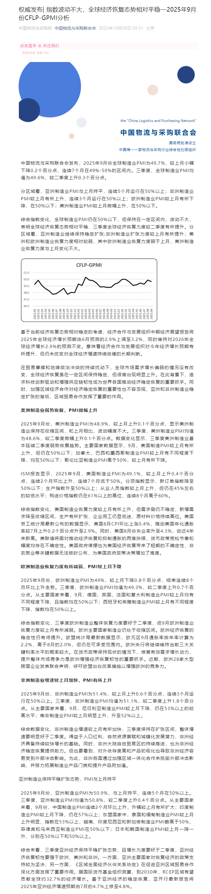 央视网消息:中国物流与采购联合会今天(10月6日)公布9月份全球制造业采购经理指数。2025年9月份全球制造业PMI为49.7%,较上月小幅下降0.2个百分点,连续7个月在49%-50%的区间内。三季度,全球制造业PMI均值为49.6%,较二季度上升0.3个百分点。