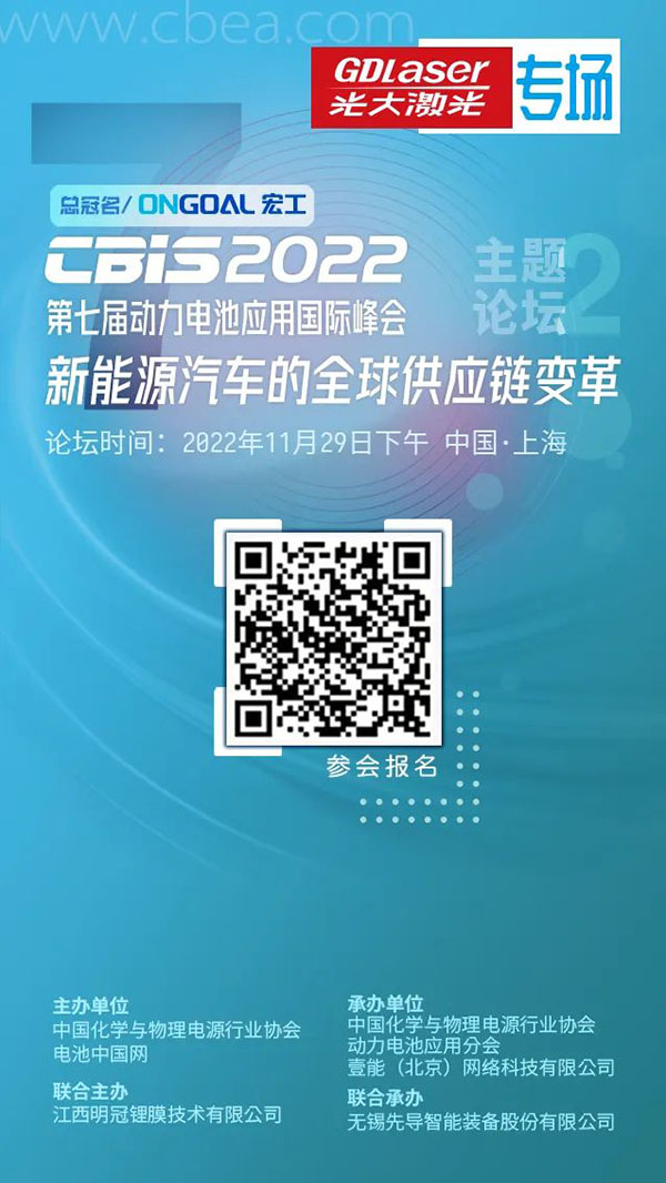 光大激光对第七届动力电池应用国际峰会(CBIS2022)给予重点支持。届时,在“光大激光·新能源汽车的全球供应链变革”专场论坛上,光大激光相关负责人将为与会嘉宾带来公司在电芯中段、PACK等环节新研发成果和解决方案的精彩分享,敬请期待!