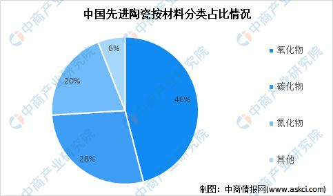 按照材料,先进陶瓷主要分为氧化物、氢化物和碳化物陶瓷等。其中,氧化物陶瓷(尤其是氧化铝陶瓷)研究和产业化应用较早,目前应用领域为广泛,使用规模也大,占比约46%。其次是碳化物陶瓷和氮化物陶瓷,占比是28%和20%。