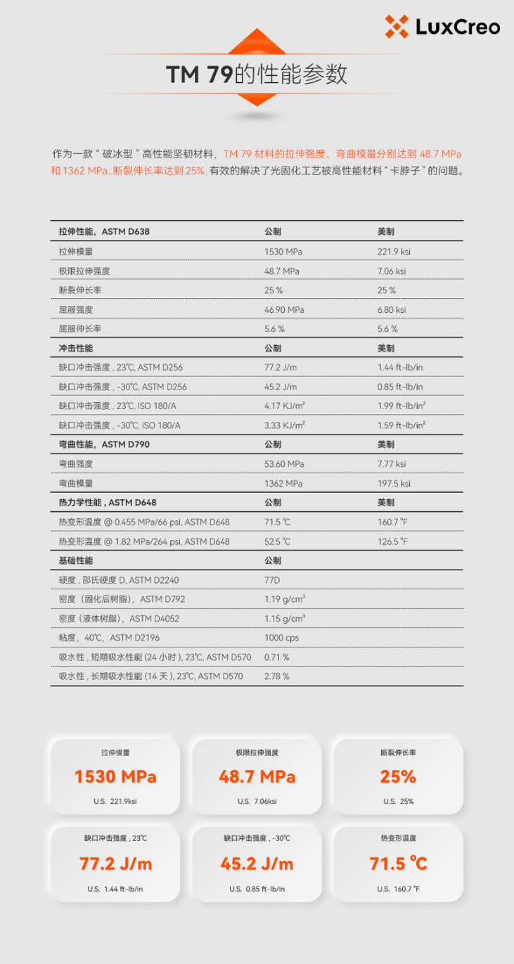 据介绍,作为一款“破冰型”高性能坚韧材料,TM79坚韧塑料的拉伸强度、弯曲模量分别达到48.7MPa和1362MPa、断裂伸长率达到25%。在市场对高性能光固化树脂材料抱有极高期望的背景下,TM79的出现有效解决了光固化工艺被高性能材料“卡脖子”的问题,搭配Lux3+工业级打印机,可使TM79发挥更大应用价值。
