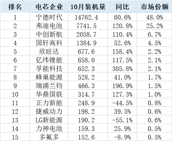 今年10月中国市场TOP15企业分别为:宁德时代、弗迪电池、中创新航、国轩高科、欣旺达、亿纬锂能、孚能科技、蜂巢能源、瑞浦兰钧、华鼎国联、正力新能、捷威动力、LG新能源、力神电池、多氟多。