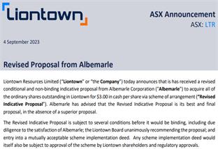 澳大利亚锂矿商Liontown称,愿意支持锂盐生产商AlbemarleCorp.(美国雅保)提出的66亿澳元(合43亿美元)的收购要约。 9月4日,澳大利亚锂矿商Li...2023-09-05 17:47:03